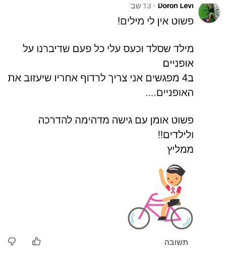 אצלי לומדים בשיטה סבלנית ומקצועית, שמותאמת לקצב האישי של כל תלמיד ותלמידה. אנחנו מפרקים את הפחד, בונים את שיווי המשקל, והופכים את הדיווש הראשון לרגע של ניצחון אמיתי. בין אם מדובר בילד שעולה לראשונה על גלגלים ובין אם במבוגר שתמיד חלם לרכוב – אני כאן כדי להבטיח שתעשו את זה בביטחון מלא ובחיוך רחב.