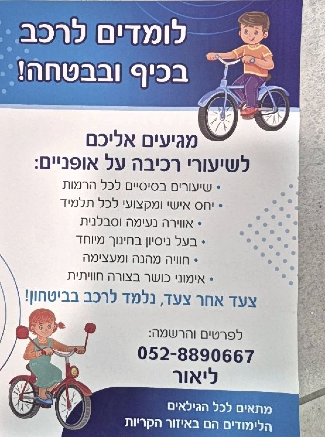 שמי ליאור שמחה, אני מאמין שרכיבה על אופניים היא הרבה מעבר לכלי תחבורה – היא תחושת חופש, עצמאות וביטחון עצמי שנשארים לכל החיים. העסק נולד מתוך תשוקה להנגיש את עולם הרכיבה לכולם, תוך שימת דגש על שני עקרונות ברזל: חוויית למידה מהנה ובטיחות ללא פשרות.